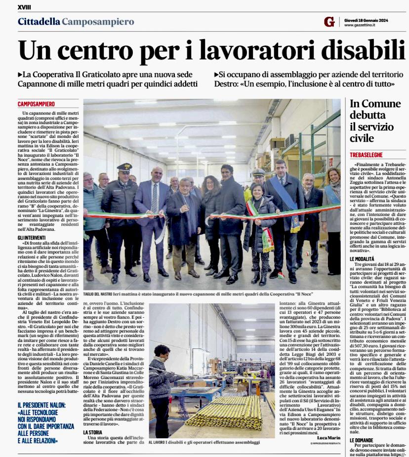 A Camposampiero è stato inaugurato un nuovo laboratorio inclusivo, un progetto promosso dalla cooperativa sociale Il Graticolato in collaborazione con La Ginestra. Con un investimento complessivo di 700 mila euro, la struttura rappresenta un esempio di integrazione tra economia e solidarietà, offrendo opportunità lavorative a persone con disabilità.